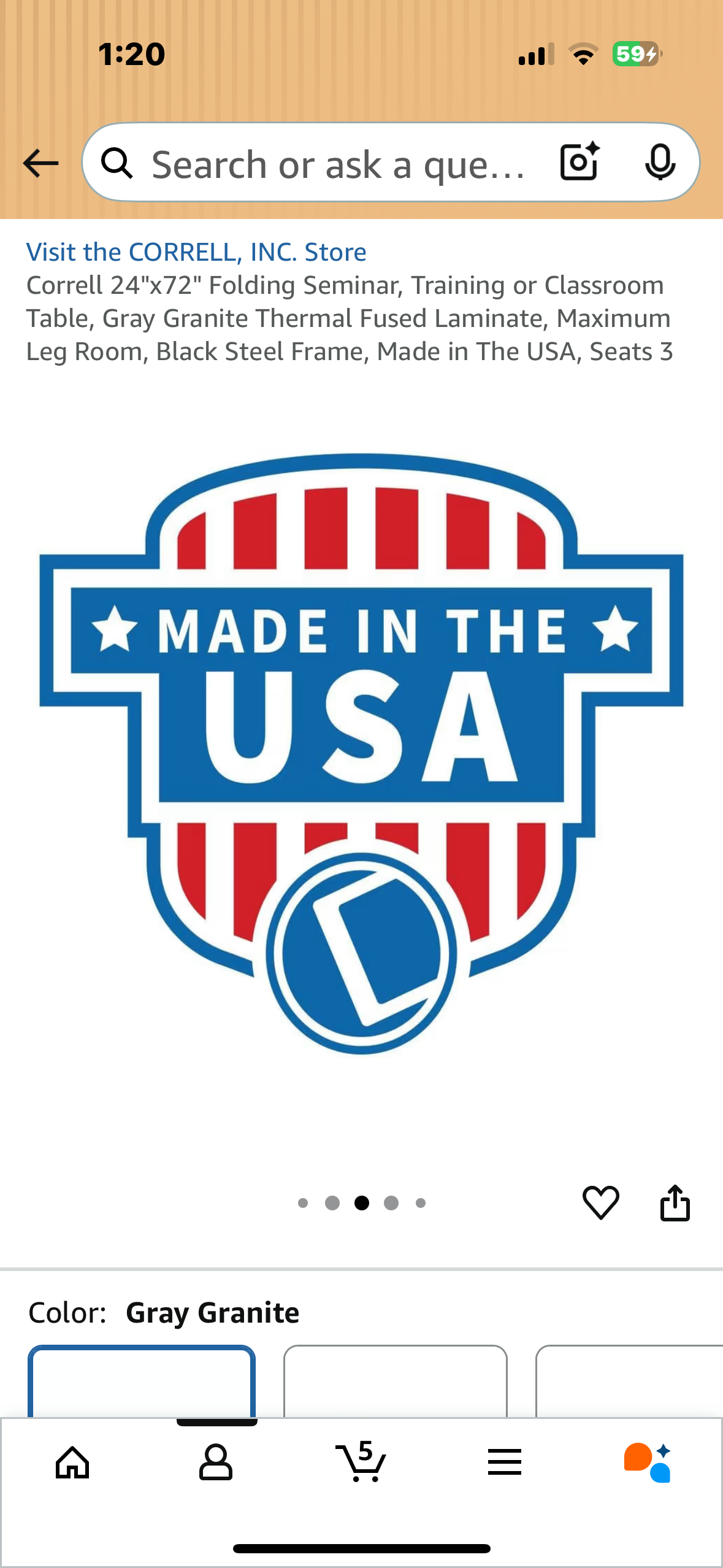 Correll 24"x72" Folding Seminar, Training or Classroom Table, Gray Granite Thermal Fused Laminate, Maximum Leg Room, Black Steel Frame, Made in The USA, Seats 3 (G887)