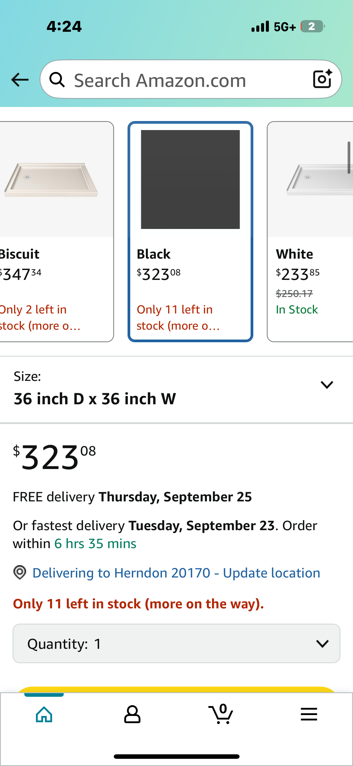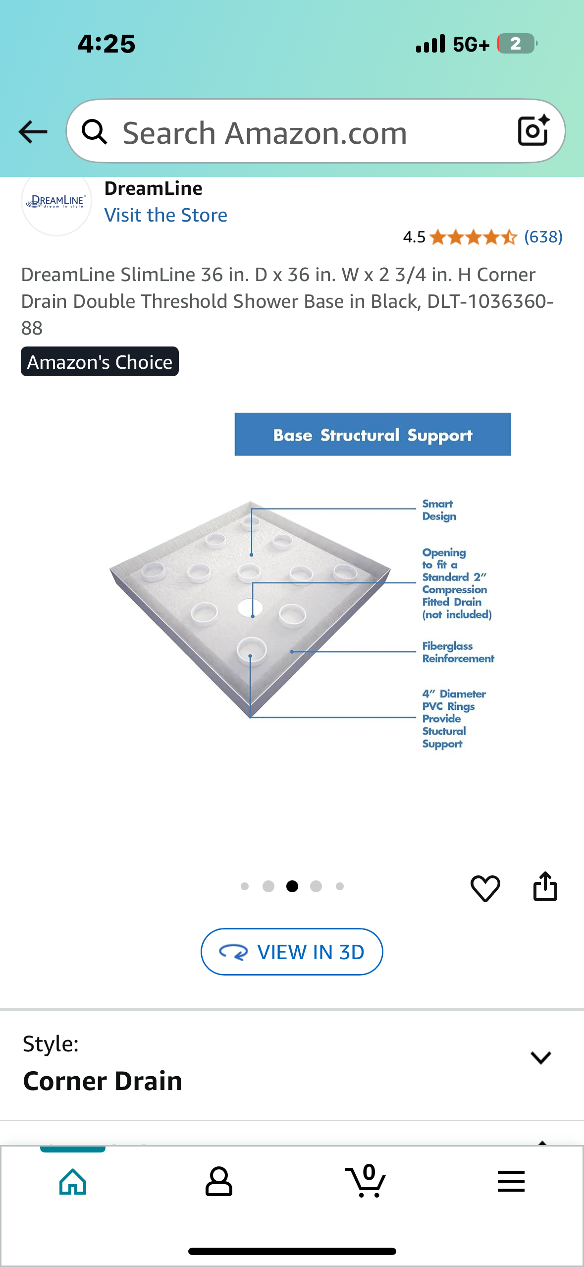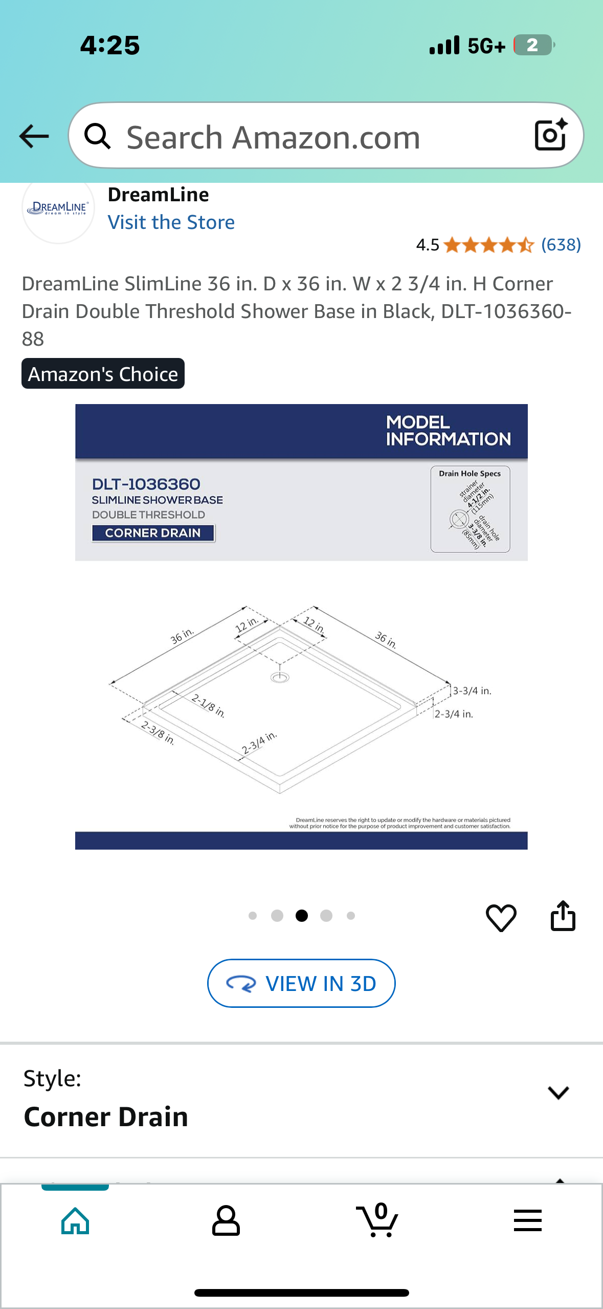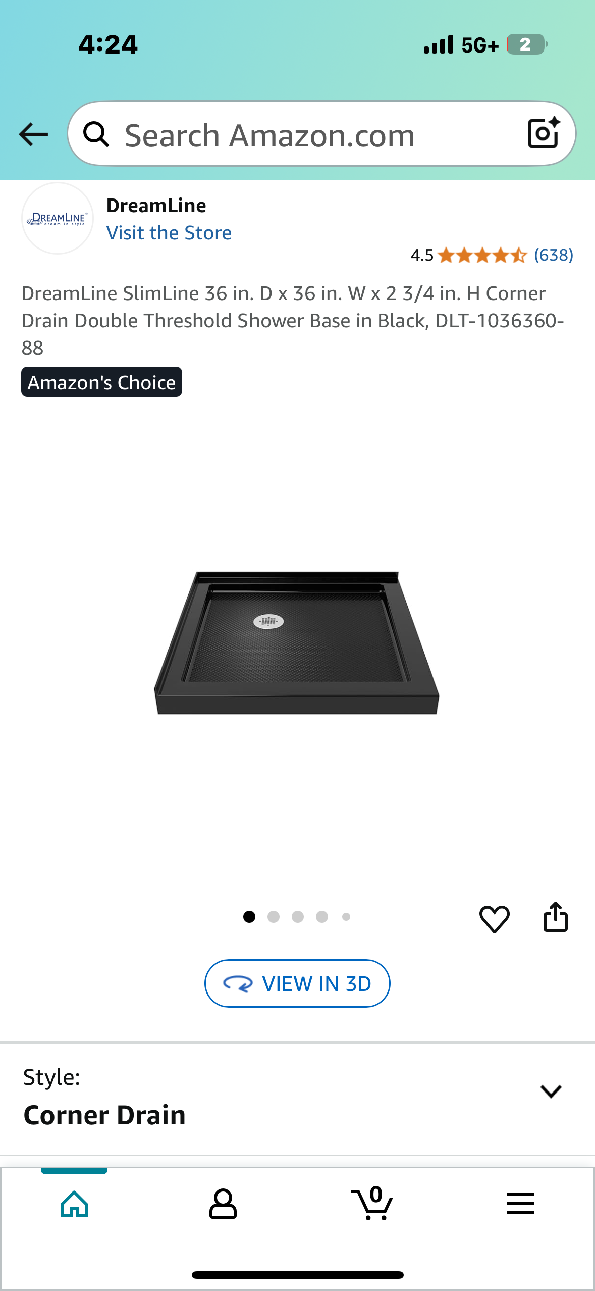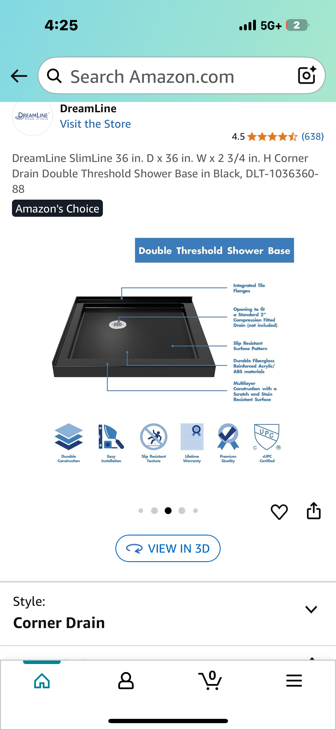 DreamLine SlimLine 36 in. D x 36 in. W x 2 3/4 in. H Corner Drain Double Threshold Shower Base in Black, DLT-1036360-88 (B1062)