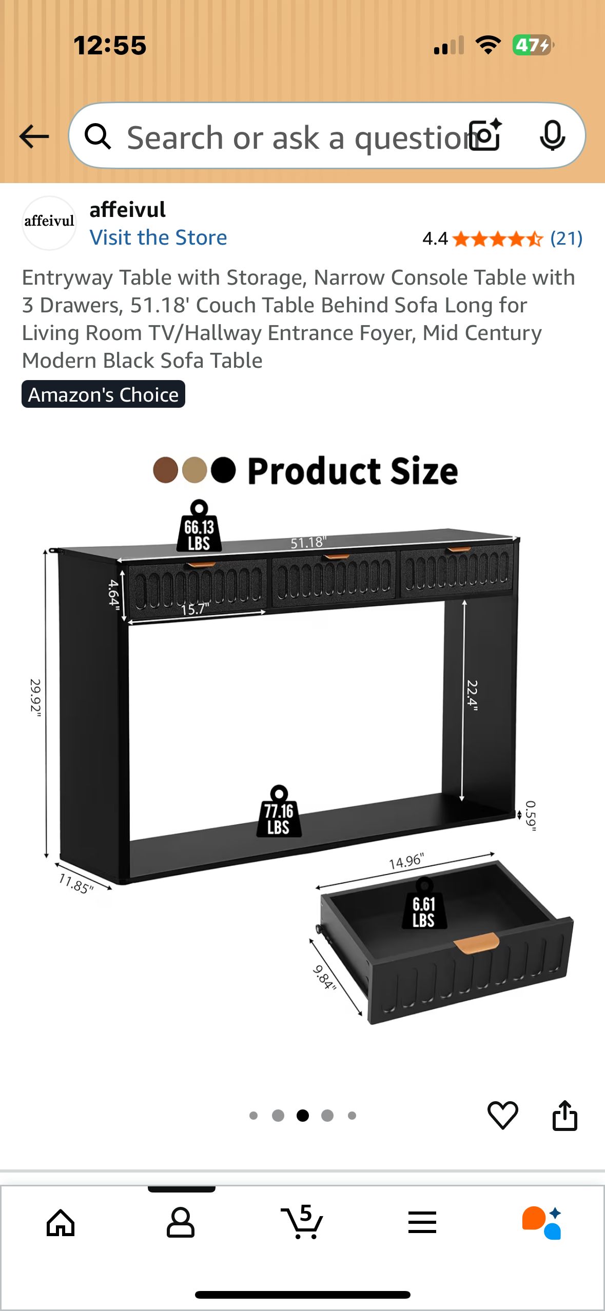 Entryway Table with Storage, Narrow Console Table with 3 Drawers, 51.18' Couch Table Behind Sofa Long for Living Room TV/Hallway Entrance Foyer, Mid Century Modern Black Sofa Table (L1075)
