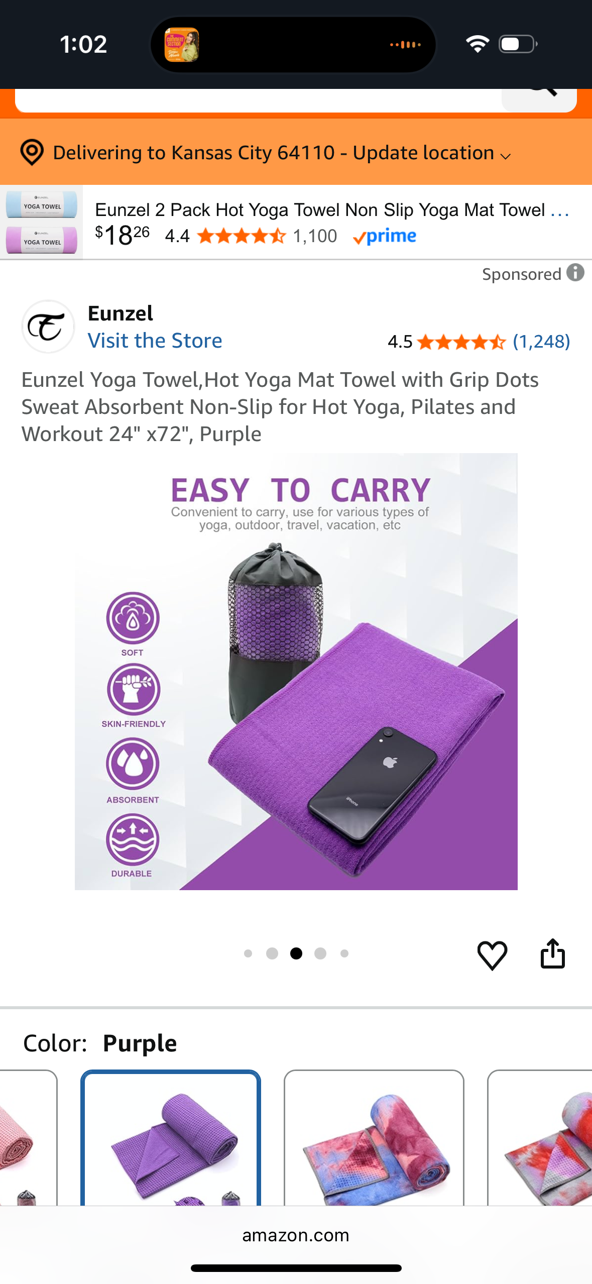 Eunzel Yoga Towel,Hot Yoga Mat Towel with Grip Dots Sweat Absorbent Non-Slip for Hot Yoga, Pilates and Workout 24" x72", Purple