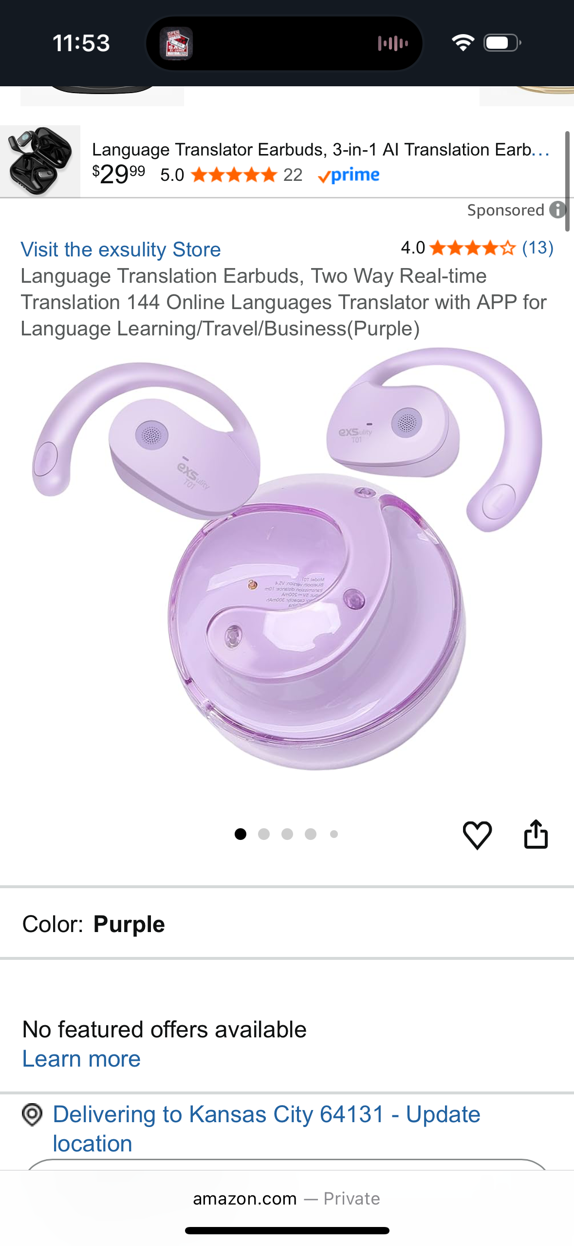 exsulity Language Translation Earbuds, Two Way Real-time Translation 144 Online Languages Translator with APP for Language Learning/Travel/Business(Purple)