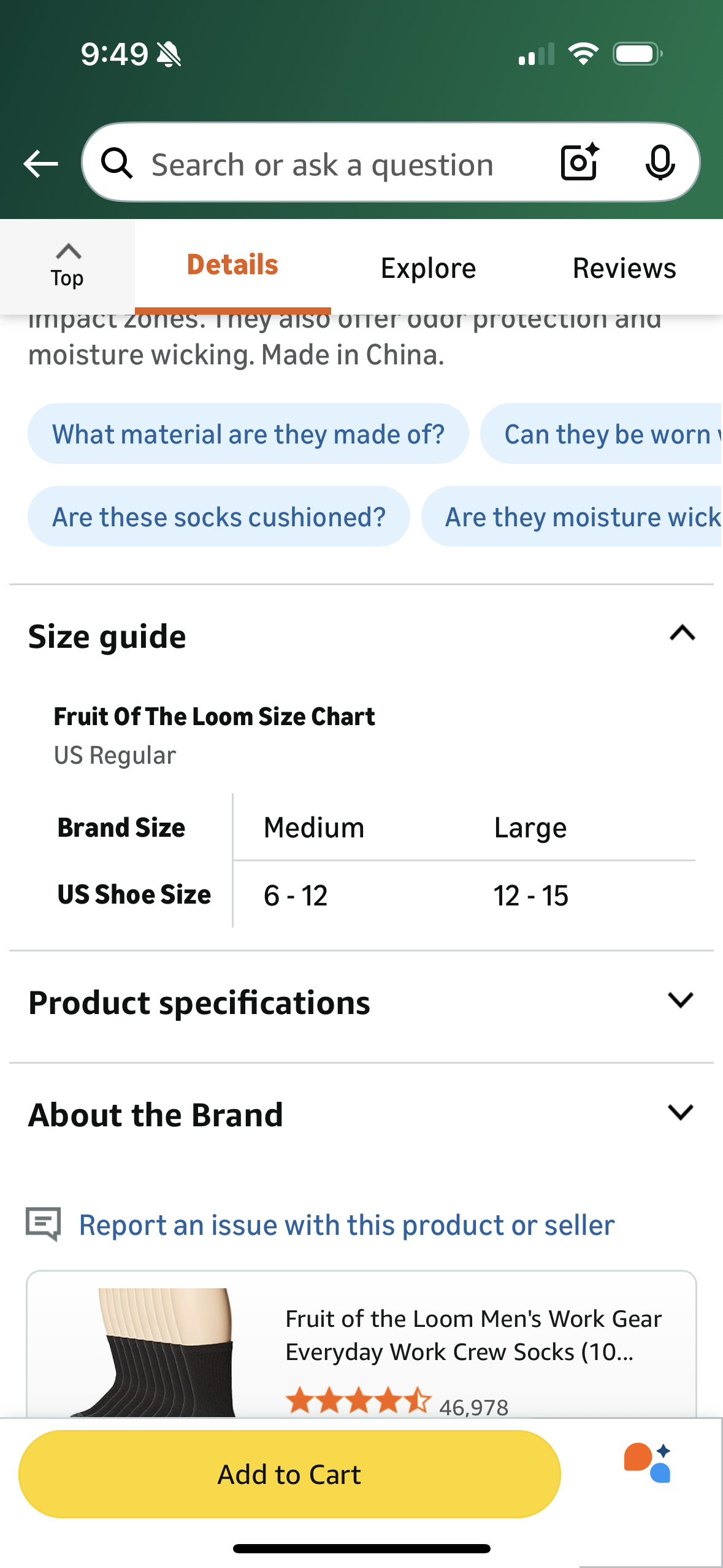 Fruit of the Loom Men's Work Gear Crew Socks, 6-Pack, Black, Large, Model# FRM10124C6C2001 Black