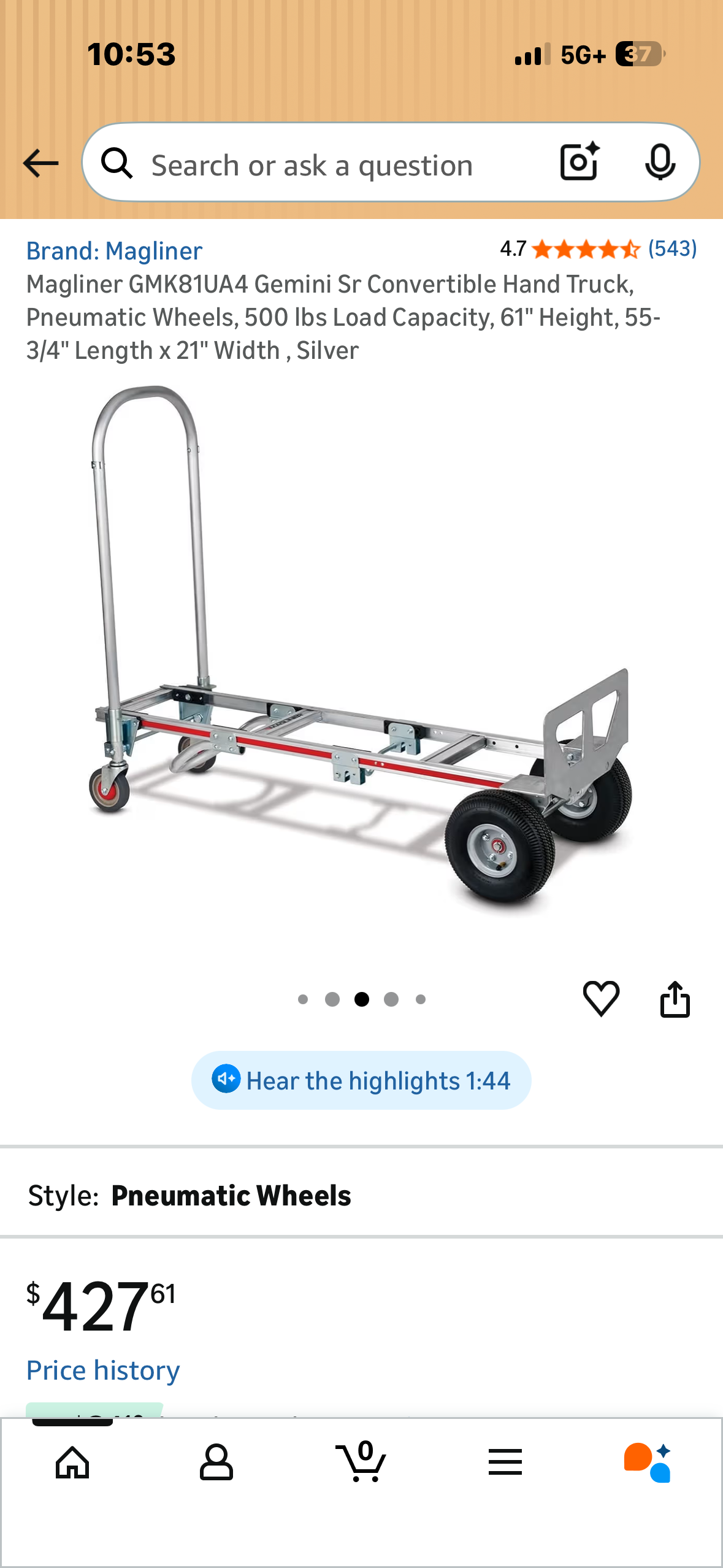 Magliner GMK81UA4 Gemini Sr Convertible Hand Truck, Pneumatic Wheels, 500 Ibs Load Capacity, 61" Height, 55- 3/4" Length × 21" Width, Silver (G1025)