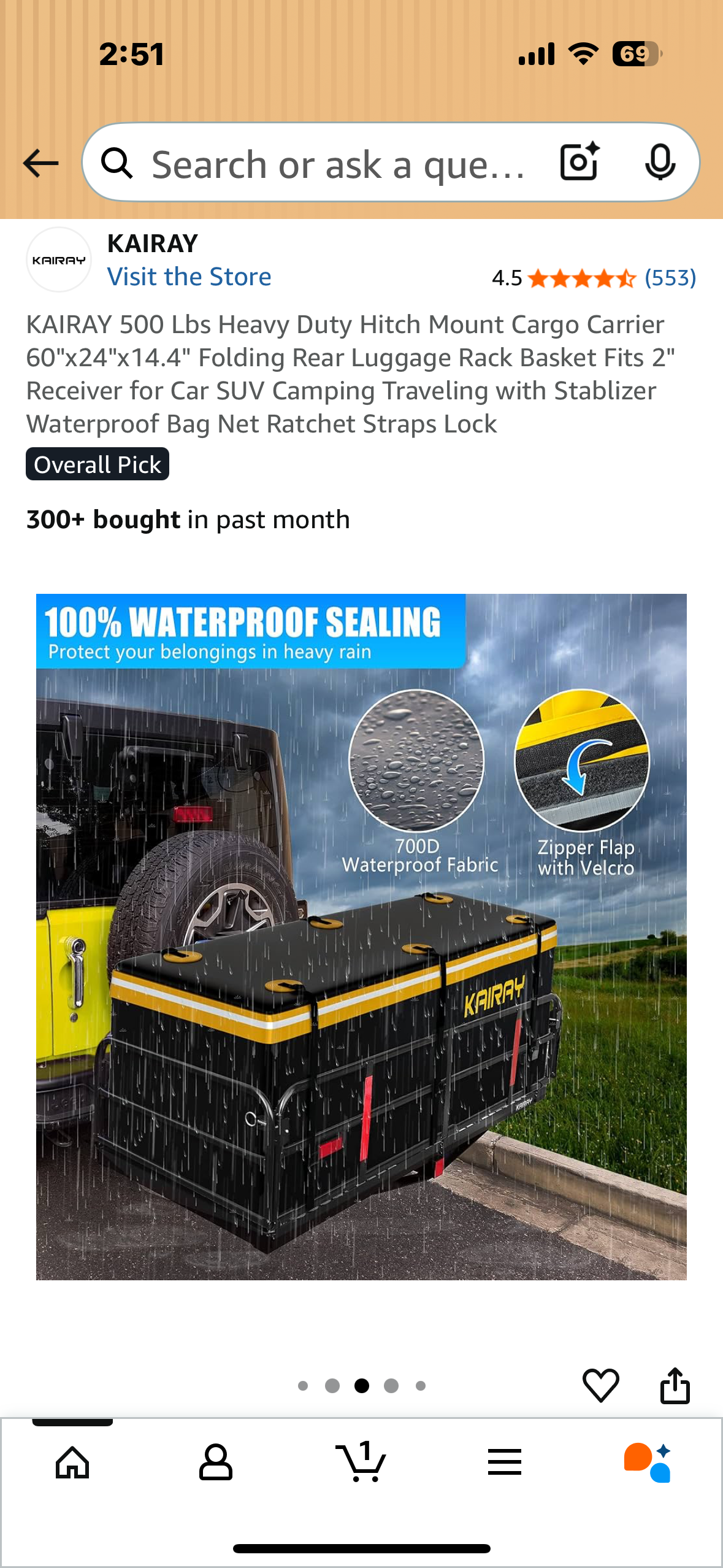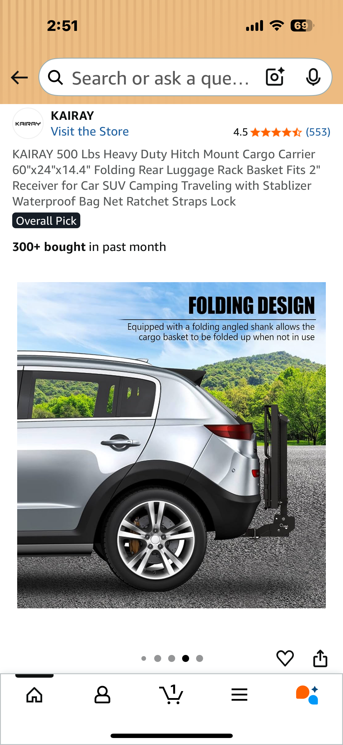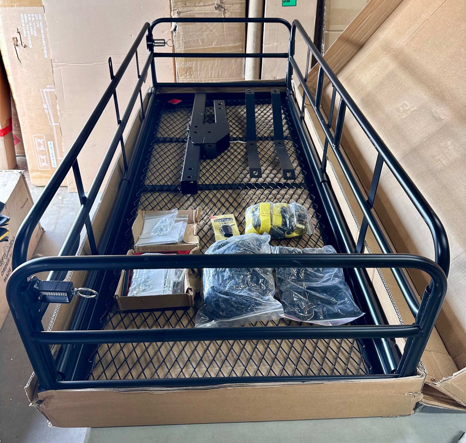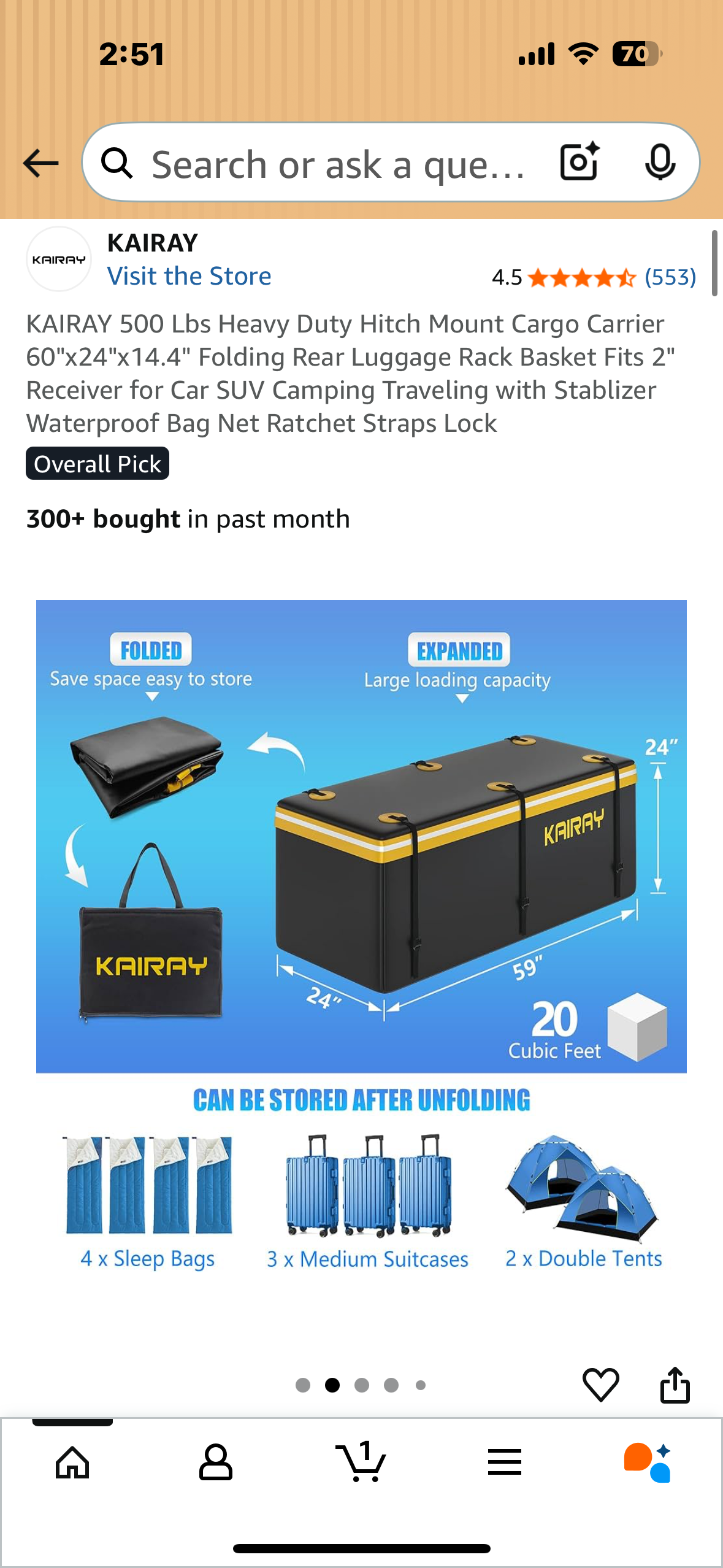 KAIRAY 500 Lbs Heavy Duty Hitch Mount Cargo Carrier, 60"x24"x14.4" Folding Rear Luggage Rack Basket, Fits 2" Receiver for Car, SUV, Camping Traveling with Stabilizer,Waterproof Bag, Net Ratchet Straps, Lock (G870)