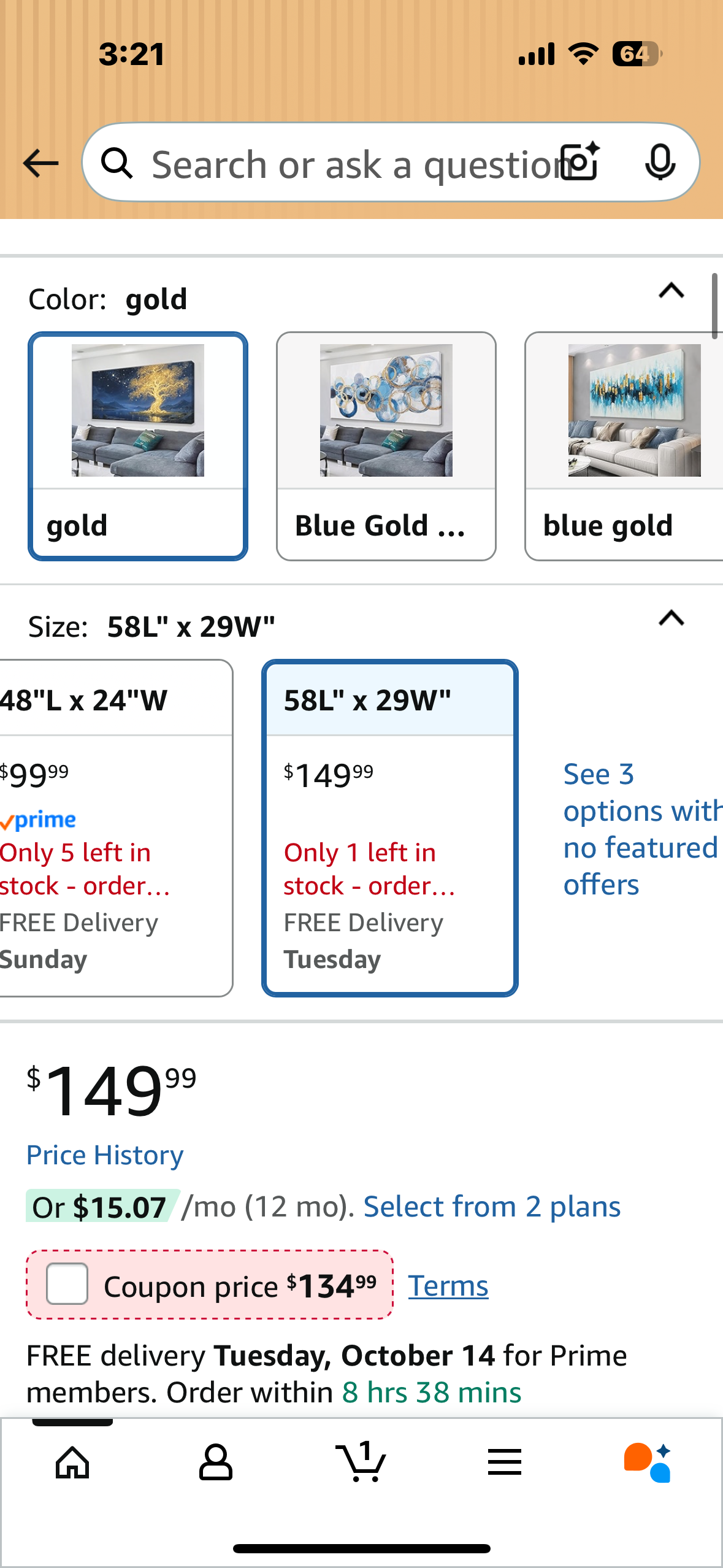 Large Gold Tree of Life Canvas For, Abstract Art Decor, For Bedroom Home or Office 29" X 58" (L1031)