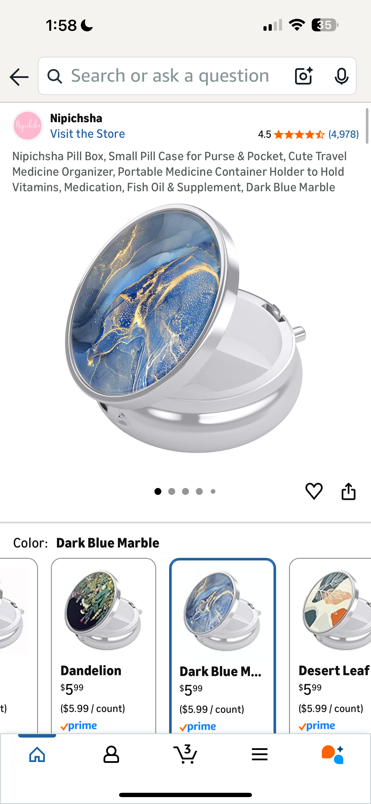 Nipichsha Pill Box, Small Pill Case for Purse & Pocket, Cute Travel Medicine Organizer, Portable Medicine Container Holder to Hold Vitamins, Medication, Fish Oil & Supplement, Dark Blue Marble