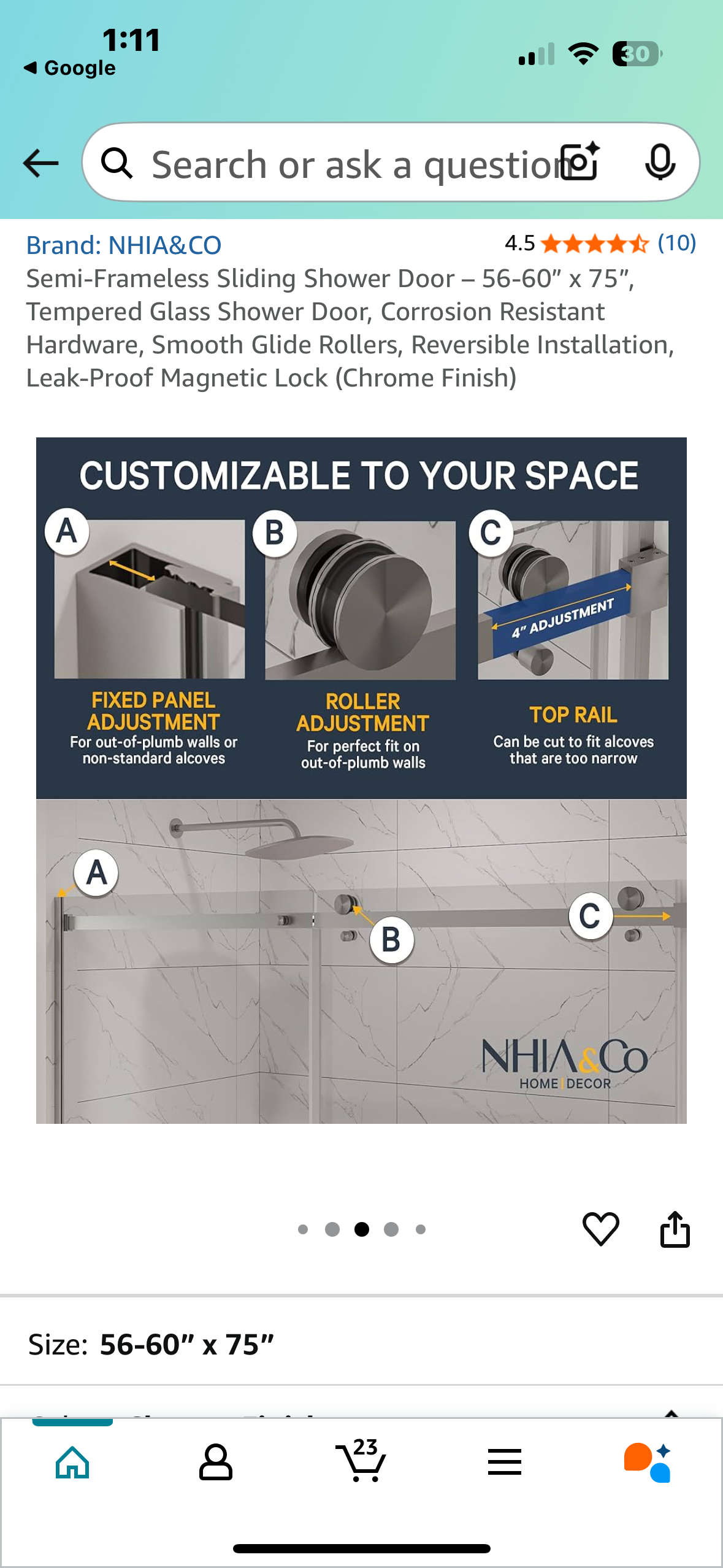 Semi-Frameless Sliding Shower Door – 56-60” x 75”, Tempered Glass Shower Door, Corrosion Resistant Hardware, Smooth Glide Rollers, Reversible Installation, Leak-Proof Magnetic Lock (Chrome Finish) (B1033)